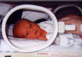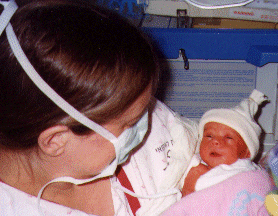 | At this point, Ima felt well enough that she got dressed in normal clothes. This was the first time in two weeks that she hadn't been wearing a hospital gown. | Mommy holding Tova near her incubator. |